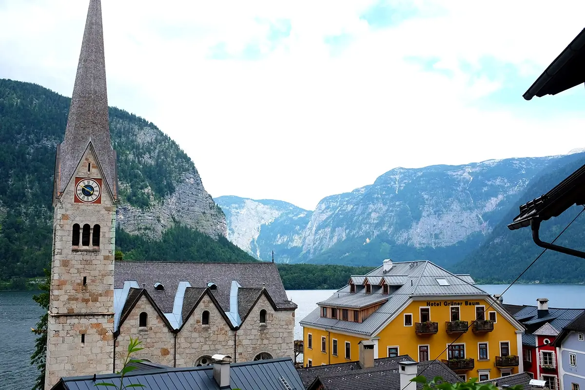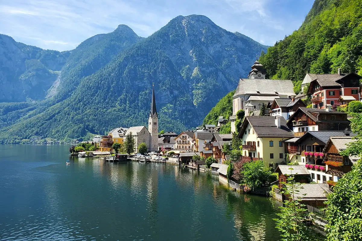 The village of Hallstatt is nestled between high mountains and the Hallstatt Lake.