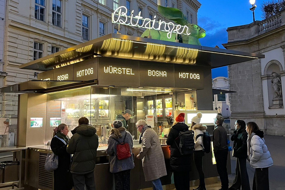 If you are a bit peckish and want a quick and inexpensive lunch, directly in front of the Albertina you will find Bitzinger Würstelstand (it has a rabbit on top). The Bitzinger sausage stand is located on Albertinaplatz directly behind the Vienna State Opera. It is one of the most famous and loved Würstelstand (sausage stands). Enjoy a Käsekrainer (cheese-filled sausage) served with Semmel or brown bread. At night, after operas, you can join the queue of Viennese dressed in the Opera finery feasting on sausages and beer.