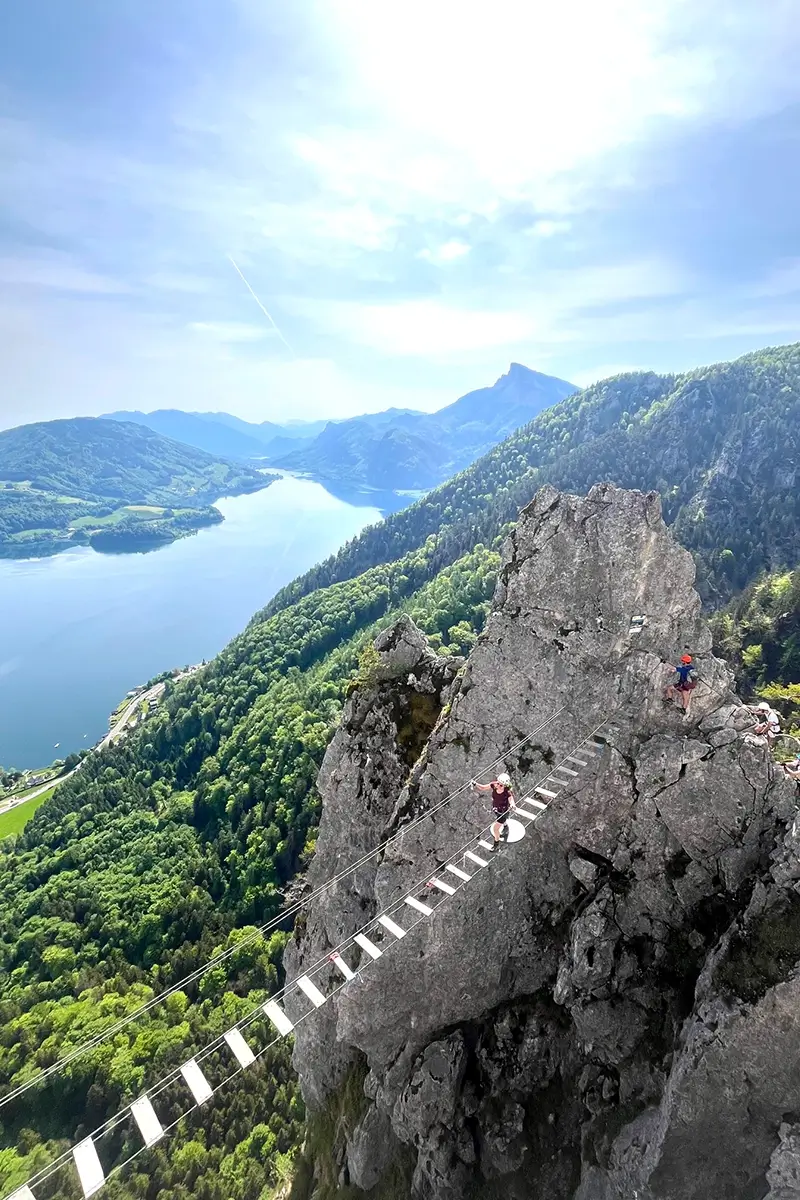 - Dachsteinwand Klettersteig via ferrata: A thrilling fixed-rope route with steep ascents, ladders, and narrow ledges with epic views of Mondsee. This route is for experienced climbers only and requires proper equipment.