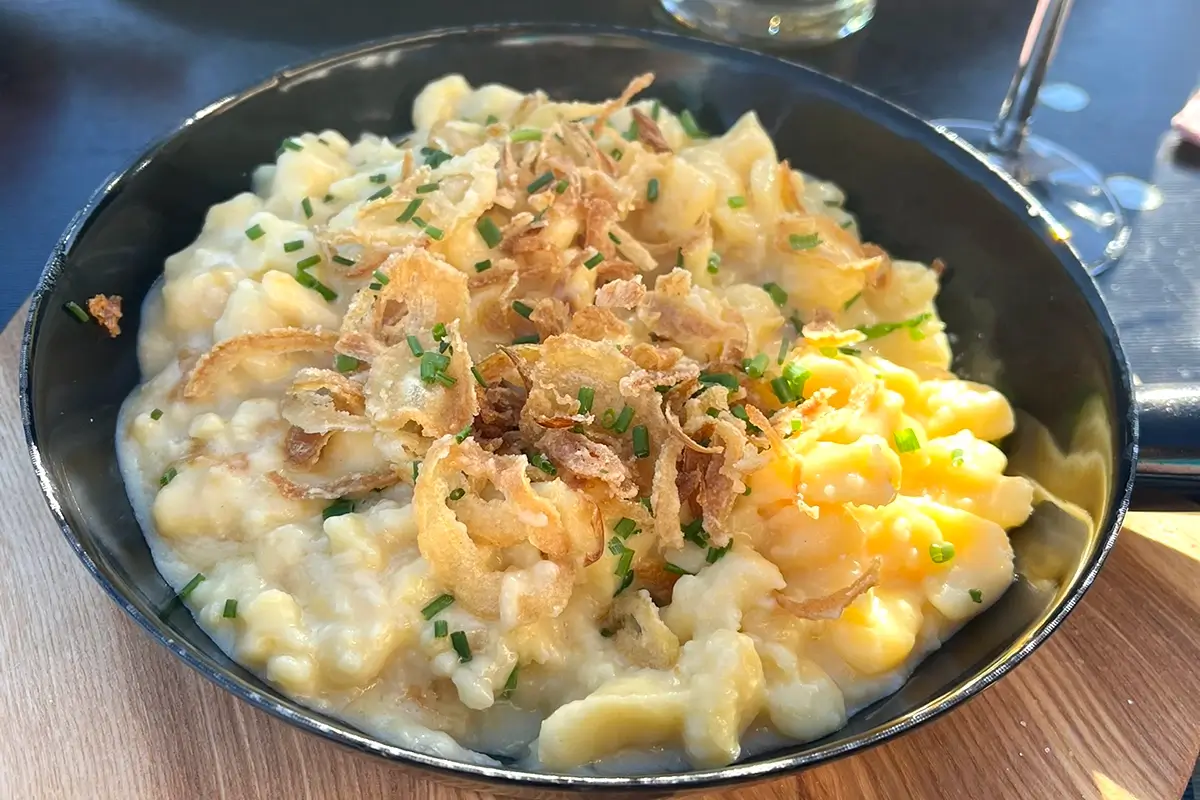 Käsespätzle, the Alpine cheesey dumplings, topped with fried onions