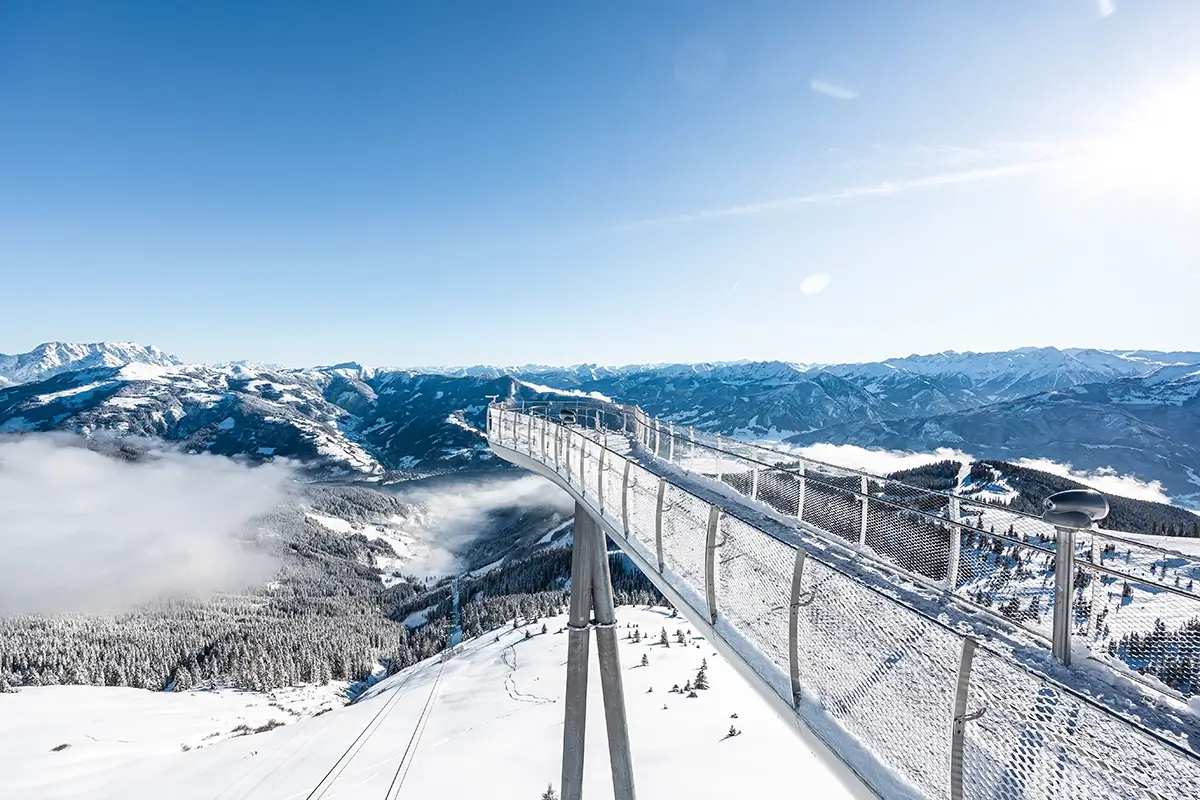 On the mountain, the Panorama Platform “Kaiserblick”, located at just under 2,000 metres, offers breathtaking views of over 30 three-thousand-metre peaks, including the Grossglockner, with Lake Zell sparkling below. Partially equipped with a glass floor and elevated 30 metres above the ground, it’s a favourite photo spot for non-skiers and families alike.