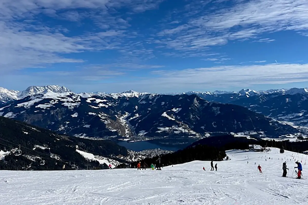 From the upper slopes on Schmittenhöhe, skiing in Zell am See is defined by uninterrupted views across Lake Zell (Zeller See), the snow-covered Kitzsteinhorn Glacier and more than 30 surrounding Alpine peaks rising above 3,000 metres (~10.000 feet).